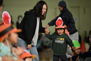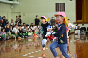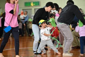 保護者の方の腰に付けたしっぽを必死に取りに行く子どもたち!間には、ラッツ&スターのめ組のひとを