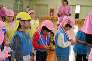 皆で行進をし、園長先生のお話を聞いたり、“げんきスイッチオン!”の準備体操をしたりしました。