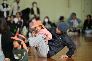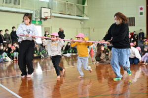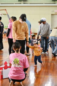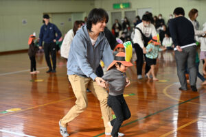 保護者の方の腰に付けたしっぽを必死に取りに行く子どもたち!間には、ラッツ&スターのめ組のひとを